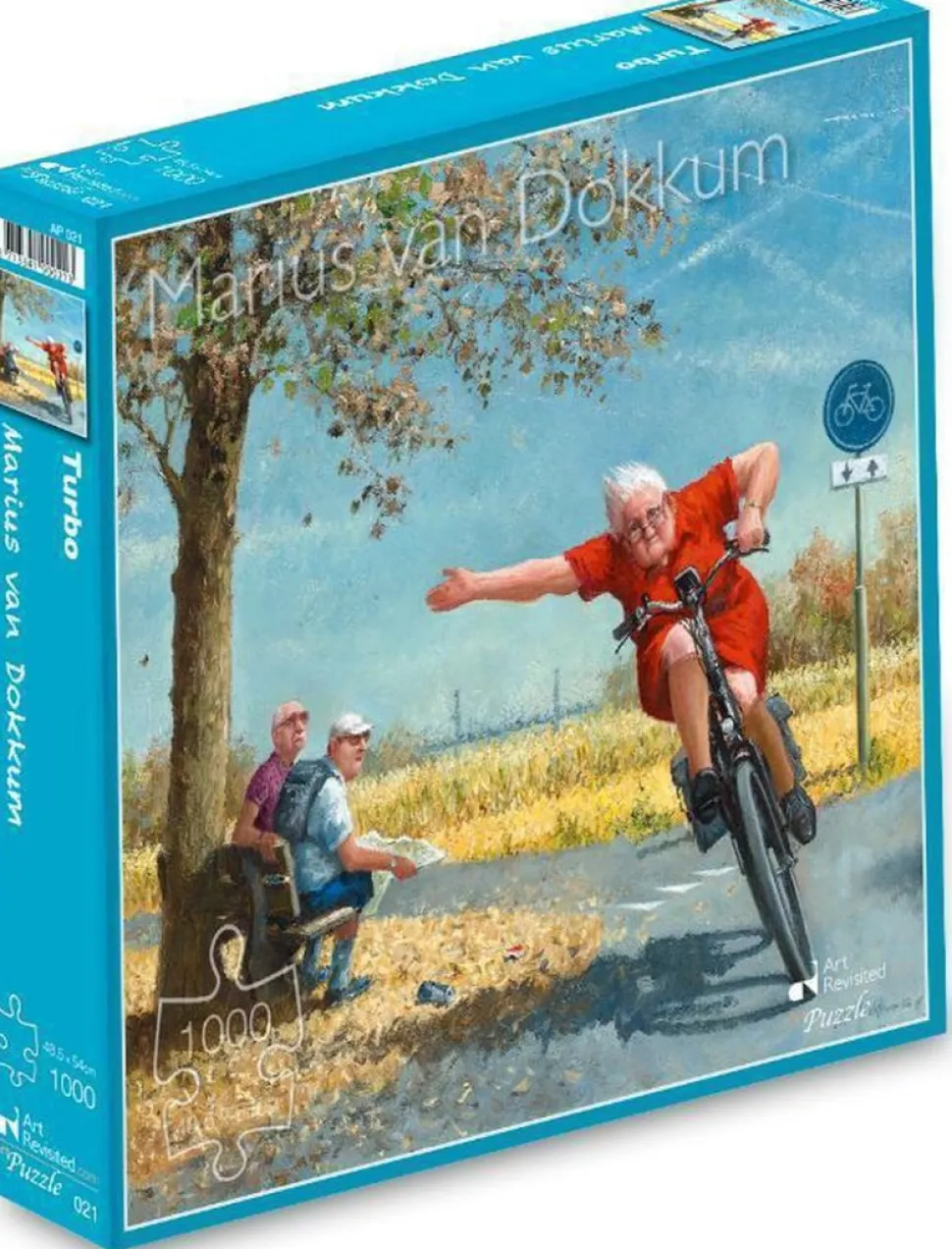 Art Revisited werkt samen met een selecte groep kunstenaars (waaronder Marius van Dokkum), die zowel artistiek als technisch tot de top behoren. Art Revisited verwerkt de kunstwerken op diverse manieren tot producten. De kunstenaar schildert, tekent of maakt een foto. Dit is het eigen Unieke werk. Art Revisited maakt van dit kunstwerk via diverse hoogwaardige fotografie en printtechnieken een kunstreproductie, Giclee genoemd. Deze worden in een vooraf met de kunstenaar afgesproken aantal verkocht. Daarnaast worden ze afgedrukt op bijvoorbeeld Kunstkaarten, Jaarkalenders, Agenda’s, Koelkastmagneten en nog veel meer. Van sommige afbeeldingen kun je gewoon geen genoeg krijgen. Daarom heeft Art Revisited van een aantal bestsellers nu ook legpuzzels, zoals deze Turbo, gemaakt. Pas als het laatste stukje gelegd is, is het beeld compleet en wordt je moeite beloond met een mooi kunstwerk.