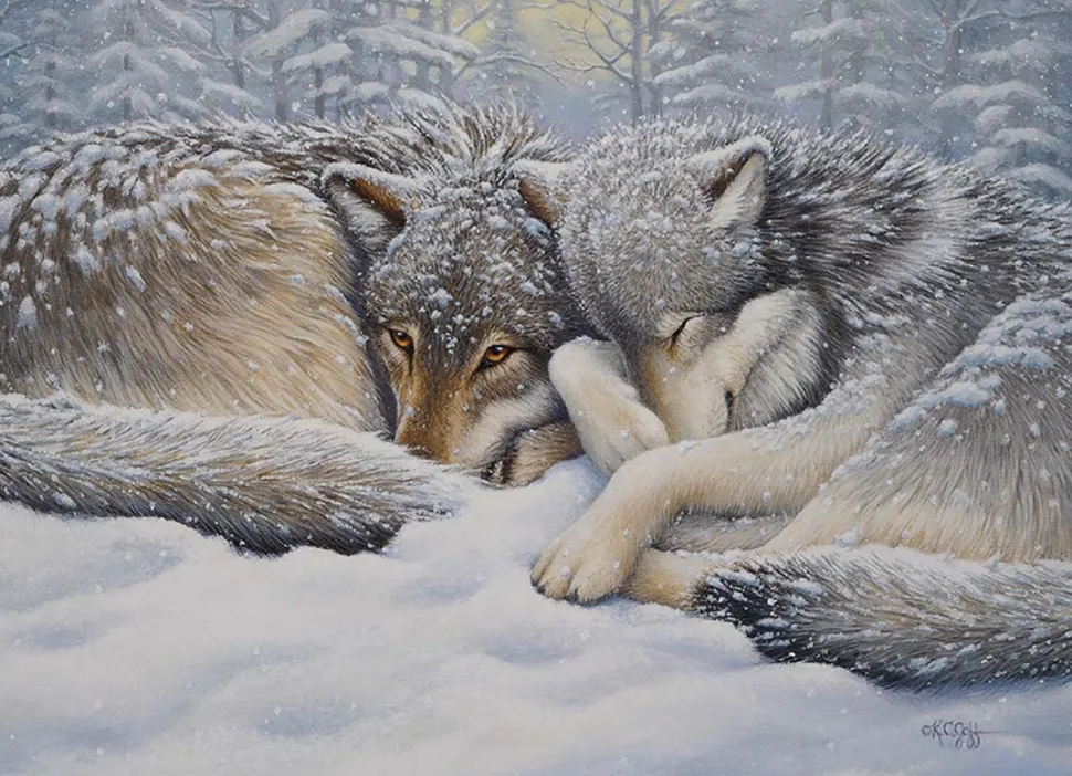 Twee wolven liggen te rusten in de sneeuw tijdens hun winterrust in deze mooie puzzel van 1000 stukjes. Artiest: Kathy Goff – Winter Repose