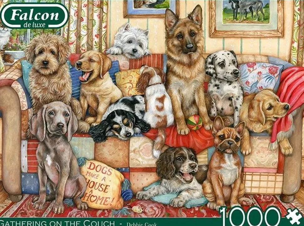 De premium de luxe-serie van Falcon werd in de jaren zeventig geïntroduceerd. Falcon is een merknaam van Jumbo, Nederlandsfabrikaat dus, dat oorspronkelijk speciaal voor de Engelstalige landen werd gevoerd. De artiesten van de Falcon legpuzzels komen daardoor ook met name uit het Verenigd Koninkrijk, zoals Debbi Cook, Steve Crisp, Sarah Adams, Claire Comerford, Anne Scarle, Kevin Walsh en vele anderen. Falcon maakt puzzels met een opvallende blauwe achterzijde en past unieke druk- en snijtechnieken toe – voor fraai afgewerkte afbeeldingen van hoge kwaliteit en met uiteenlopende thema’s, zoals deze Gathering on the Couch. Er zijn verschillende onderwerpen, bijvoorbeeld uiterst gedetailleerde cottages, nostalgische platteland taferelen en opvallende andere beelden. De Falcon puzzels zijn ontworpen en geproduceerd met passie voor kwaliteit. De gelegde puzzels van Falcon toont uiteindelijk een naadloos geheel, en elk puzzelstukje is uniek. Falcon de luxe is synoniem voor kwaliteit, traditie en ongeëvenaarde keuze. Het optimale puzzelplezier beleef je met deze Gathering on the Couch.