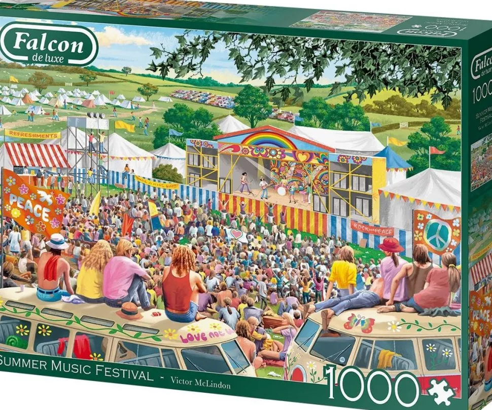 De premium de luxe-serie van Falcon werd in de jaren zeventig geïntroduceerd. Falcon is een merknaam van Jumbo, Nederlandsfabrikaat dus, dat oorspronkelijk speciaal voor de Engelstalige landen werd gevoerd. De artiesten van de Falcon legpuzzels komen daardoor ook met name uit het Verenigd Koninkrijk, zoals Debbi Cook, Steve Crisp, Sarah Adams, Claire Comerford, Anne Scarle, Kevin Walsh en vele anderen. Falcon maakt puzzels met een opvallende blauwe achterzijde en past unieke druk- en snijtechnieken toe – voor fraai afgewerkte afbeeldingen van hoge kwaliteit en met uiteenlopende thema’s, zoals deze Summer Music Festival. Er zijn verschillende onderwerpen, bijvoorbeeld uiterst gedetailleerde cottages, nostalgische platteland taferelen en opvallende andere beelden. De Falcon puzzels zijn ontworpen en geproduceerd met passie voor kwaliteit. De gelegde puzzels van Falcon toont uiteindelijk een naadloos geheel, en elk puzzelstukje is uniek. Falcon de luxe is synoniem voor kwaliteit, traditie en ongeëvenaarde keuze. Het optimale puzzelplezier beleef je met deze Summer Music Festival.