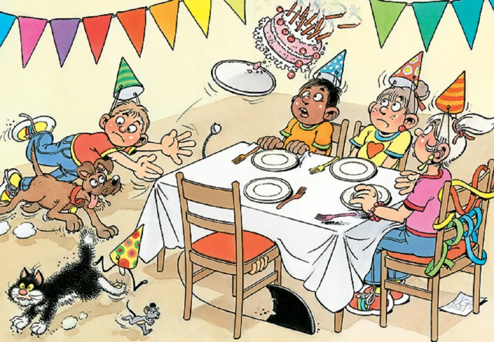 De vrienden van Jan van Haasteren zijn jarig en staan klaar om de kaarsjes uit te blazen! Maar plotseling staat de hond in de weg en struikelt de jarige. Waar komt de vliegende verjaardagstaart terecht?