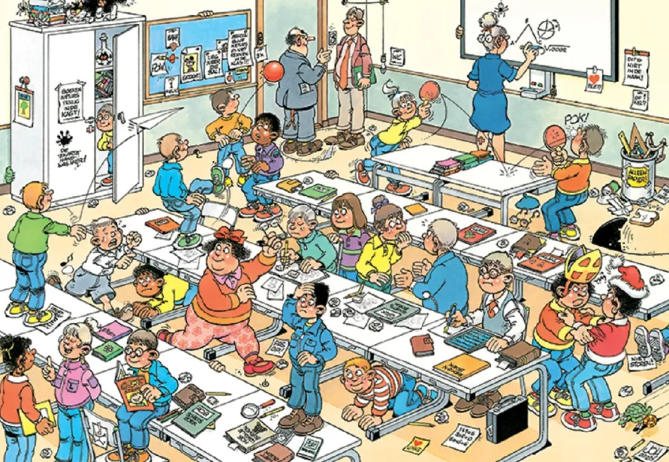 Letten de vrienden van Jan van Haasteren op tijdens de les? Ondanks het feit dat de leraar ogen in haar achterhoofd heeft, kunnen sommigen van hen het niet helpen ondeugend te zijn!