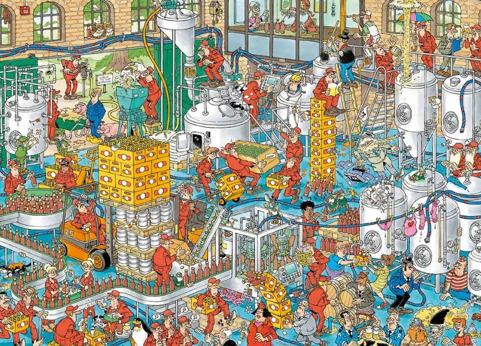 In deze ambachtelijke brouwerij zie zie je het brouwproces van begin tot eind. Sommige stappen lijken misschien wat chaotisch, maar het eindresultaat mag er zijn! Zelfs de agenten zijn té afgeleid en zijn voor het eerst eens niet bezig met het vangen van de boef. Een Jan van Haasteren puzzel is meer dan een gewone legpuzzel: het is een avonturenserie, met vertrouwde hoofdrolspelers in een eindeloos decor vol absurde details. Ontdek alle doldwaze avonturen van de Jan van Haasteren-familie!