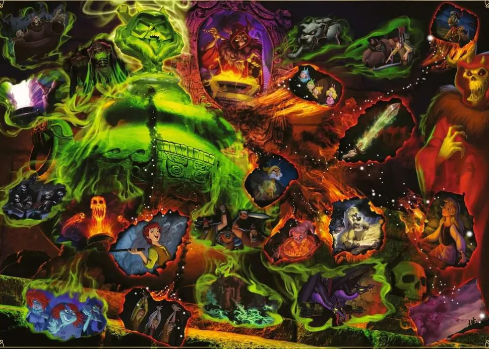 Niet alleen de hoofdrolspelers van de Disney tekenfilms zijn bekend en beroemd maar even zo zijn dit de Schurken. Zonder de grote “Schurk” zouden de films ook lang niet zo spannend zijn. De Boze Heks van Doornroosje en De Verschrikkelijke Ursula uit de Kleine Zeemeermin en de Hilarische Kapitein Haak, wie heeft ze niet op het netvlies staan. Maar ook de hedendaagse Disneyfilms kennen alweer heel herkenbare boosaardige types zoals Hades en Dr Facilier en deze Villainous Horned King een heel erg griezelig personage uit de film Taran en de Toverketel. Deze puzzels blinken uit door de prachtige felle kleuren en ze zijn allemaal opgebouw met diverse afbeeldingen uit de film. De echte Disneyfan die alle Helden en Heldinnen al heeft kan zijn hart ophalen met deze geweldige mooie legpuzzels. Werkelijk een geweldige aanvulling op elke collectie Disneyfilm legpuzzels.