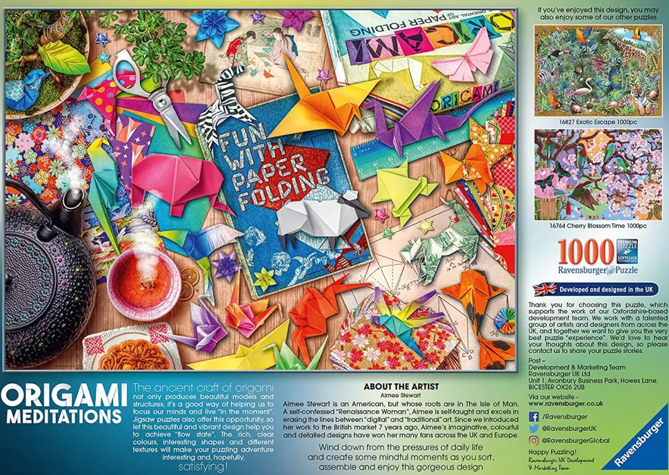Ontsnap uit de realiteit en stap in de wereld van Ravensburger puzzels. Deze Ravensburger puzzel van 1000 stukjes is geschikt voor zowel beginnende als ervaren puzzelaars. En omdat onze geliefde puzzels een standaard formaat hebben, kun je het resultaat inlijsten en ophangen. Dankzij de met de hand gemaakte stansmessen is de vormvariatie van de stukjes oneindig. Jong en oud zullen genieten van deze Origami Meditatie puzzel met 1000 stukjes.