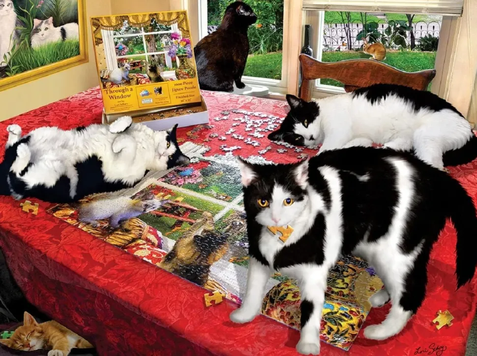 De collectie bevat geen puzzels op basis van foto’s, iedere puzzel is een tekening of schilderij van een artiest, waarvan op basis van een licentie legpuzzels worden gemaakt (licensed artwork). Zo ook deze legpuzzel Who Let The Cats Out van Lori Schory