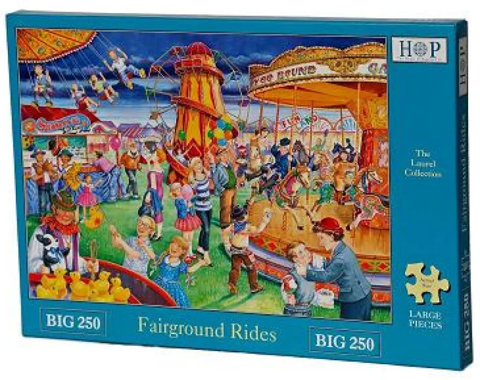 Voor de afbeedingen van de puzzels maakt HOP gebruik van een aantal gerenomeerde kunstenaars zoals bij deze legpuzzel; kermis in de stad; niet alleen de kinderen, maar ook de “oudjes” vermaken zich in de draai- en zweefmolen, met eendjes vangen en bij de schiettent, Fairground Rides van LINDA BIRKINSHAW.