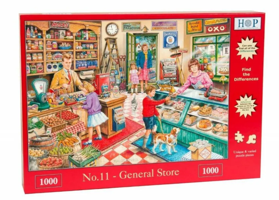 Voor de afbeedingen van de puzzels maakt HOP gebruik van een aantal gerenomeerde kunstenaars zoals bij deze legpuzzel General Store van RAY CRESSWELL. Deze puzzel is net even anders, dan anders…er zitten namelijk 15 verschillen tussen de plaat op de doos en de puzzel die je uiteindelijk gaat maken. Kun jij de 15 verschillen ontdekken in deze General Store, nummer 11 in de serie Find the Differences?