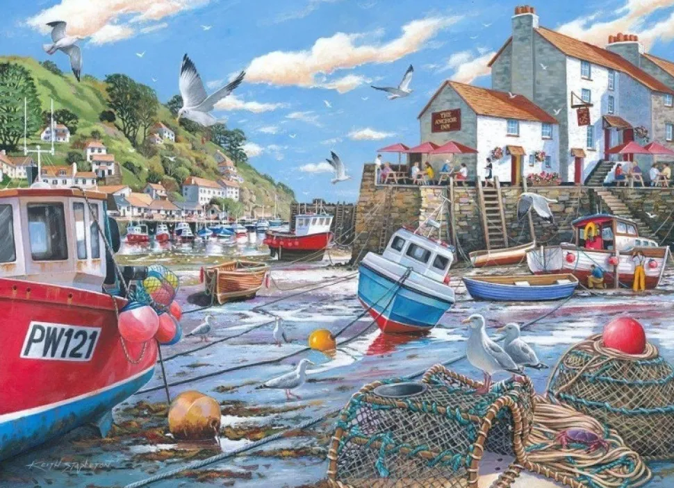 Voor de afbeedingen van de puzzels maakt HOP gebruik van een aantal gerenomeerde profesionele kunstenaars zoals bij deze legpuzzel, Low Tide van Keith Stapleton.