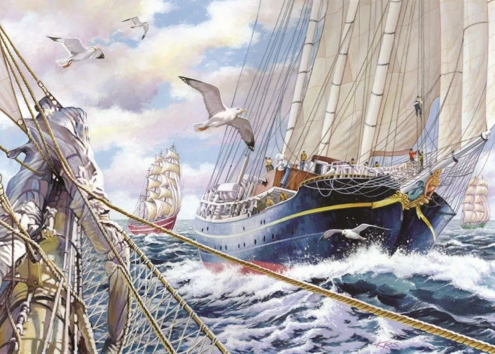 Voor de afbeedingen van de puzzels maakt HOP gebruik van een aantal gerenomeerde kunstenaars zoals bij deze legpuzzel, waar de zeilschepen op zee stoeien met de woeste golven, Steady As She Goes van KEITH STAPLETON.