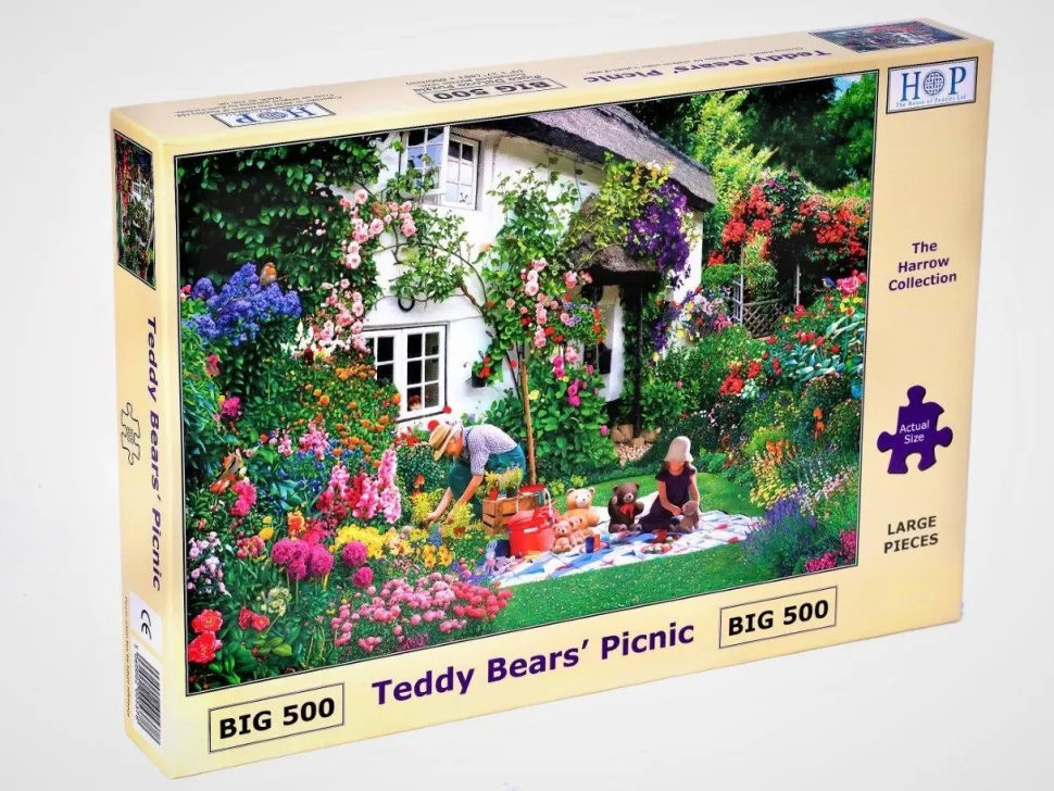 De legpuzzels van het Engelse puzzelmerk The House of Puzzels, veelal afgekort tot HOP, onderscheiden zich op twee belangrijke punten van alle andere puzzelmerken. Zoals ook deze Teddy Bears’ Picnic met 500 XL (BIG) stukken. Het eerste kenmerk is de bijzonder gevormde legpuzzelstukjes. Als je eenmaal een fan bent van deze stukjes dan wil je niet meer anders. Het is echt heel leuk puzzelen. Het tweede kenmerk is dat alle afbeeldingen van de puzzels vallen in het segment Nostalgie. De afbeeldingen brengen je terug in de tijd. Een warme tijd, een tijd van er voor elkaar zijn. Een tijd van familie en traditie. De verhalen van vroeger komen tot leven tijdens het puzzelen. Er zijn twee zeer uitgebreide puzzellijnen met extra grote grote stukken. De 500 XL en de 250 XL. Vooral de 250 XL puzzels zijn uitermate geschikt voor de wat ouderen onder ons. Met deze puzzels wordt ook veel in Verpleeghuizen gepuzzeld. Elk jaar brengt HOP voor kerstmis een unieke kerstpuzzel uit. Dit is de Christmas Collectors Editie. In deze puzzels (uitvoering 500 en 1000 stukjes) zitten uniek gevormde kerststukjes. Veel leuker kan een kerstpuzzel maken echt niet worden
