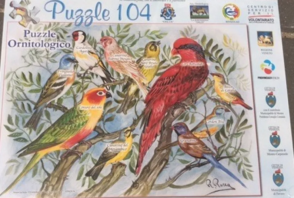 Legpuzzel van 104 stukjes (49×34 cm) van Ornitologie, allemaal vogeltjes, met de benaming in het Italiaans (Cardellino Agata, Canarino Rubino Mosaico, Canario Nero Bruno Giallo, Lori Reticolato, Becco di Corallo, Canuro del Sole, Canarino del Mozambico, Granatino, Cordon Blu). De vogels zijn geschilderd door R. Rocca. Er zijn in totaal twee verschillende puzzels van dit soort.