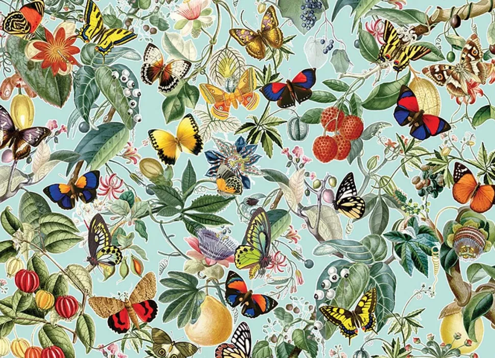 Fladderende vlinders fladderen rond groene bladeren, vers fruit en geurige bloemen in deze puzzel van 1000 stukjes!