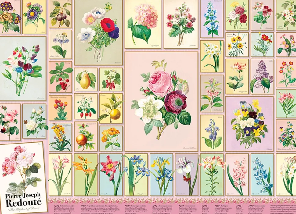 Het levensechte werk van de botanisch kunstenaar Pierre-Joseph Redoute vormt een fantastische, bloemrijke kunstpuzzel, die ook een educatieve tijdslijn van het leven en het werk van de kunstenaar bevat.