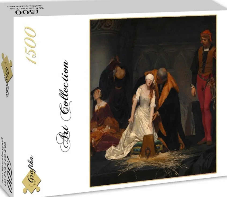 De legpuzzels van het Franse merk Grafika zijn van een zeer goede kwaliteit. Grafika heeft een zeer uitgebreide collectie van “museum” legpuzzels. In deze musseum collectie vindt je een diverheid van meesterwerken van de Oude Meesters van welleer. Zo ook deze puzzel Maar ook wat minder bekende werken en schilders komen aan bod. Alle kunststromingen zijn vertegenwoordigd. Als je graag dit soort puzzels maakt, dan kan je, je hart ophalen. Zo ook met deze legpuzzel De Executie van Lady Jane Grey van Paul Delaroche.