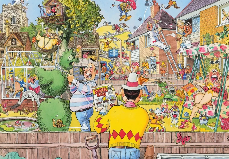 Het is een snoeihete zomerdag en het lijkt alsof iedereen in de tuin bezig is om de zon op te zoeken. Maar waarom kijkt iedereen toch naar die ene buurman? Stel je voor dat jij de man bent die de vormboom knipt; wat heeft hij gezien waardoor hij als een kip zonder kop te werk gaat? Dat is het beeld dat jij puzzelt.