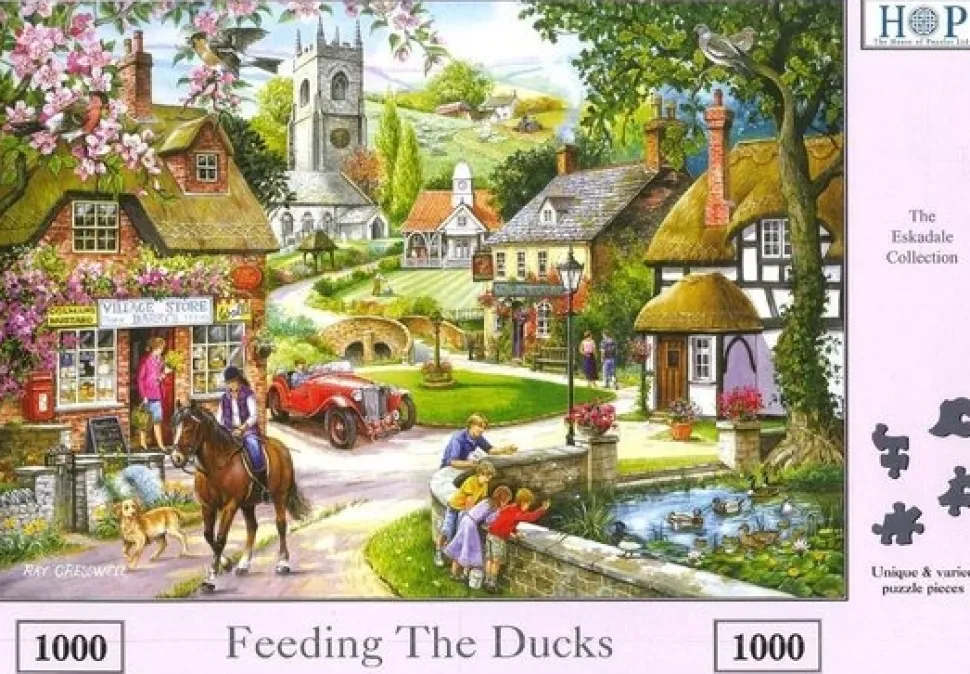 Voor de afbeedingen van de puzzels maakt HOP gebruik van een aantal gerenomeerde kunstenaars zoals bij deze legpuzzel Feeding the Ducks van RAY CRESSWELL.