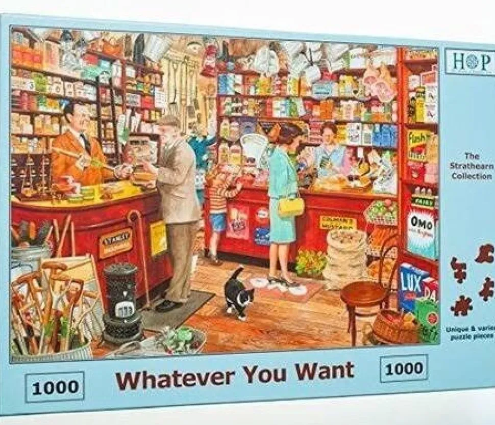 De legpuzzels van het Engelse puzzelmerk The House of Puzzels, veelal afgekort tot HOP, onderscheiden zich op twee belangrijke punten van alle andere puzzelmerken. Zoals ook deze Whatever You Want van 1000 stukjes. Het eerste kenmerk is de bijzonder gevormde legpuzzelstukjes. Als je eenmaal een fan bent van deze stukjes dan wil je niet meer anders. Het is echt heel leuk puzzelen. Het tweede kenmerk is dat alle afbeeldingen van de puzzels vallen in het segment Nostalgie. De afbeeldingen brengen je terug in de tijd. Een warme tijd, een tijd van er voor elkaar zijn. Een tijd van familie en traditie. De verhalen van vroeger komen tot leven tijdens het puzzelen. Er zijn twee zeer uitgebreide puzzellijnen met extra grote grote stukken. De 500 XL en de 250 XL. Vooral de 250 XL puzzels zijn uitermate geschikt voor de wat ouderen onder ons. Met deze puzzels wordt ook veel in Verpleeghuizen gepuzzeld. Elk jaar brengt HOP voor kerstmis een unieke kerstpuzzel uit. Dit is de Christmas Collectors Editie. In deze puzzels (uitvoering 500 en 1000 stukjes) zitten uniek gevormde kerststukjes. Veel leuker kan een kerstpuzzel maken echt niet worden