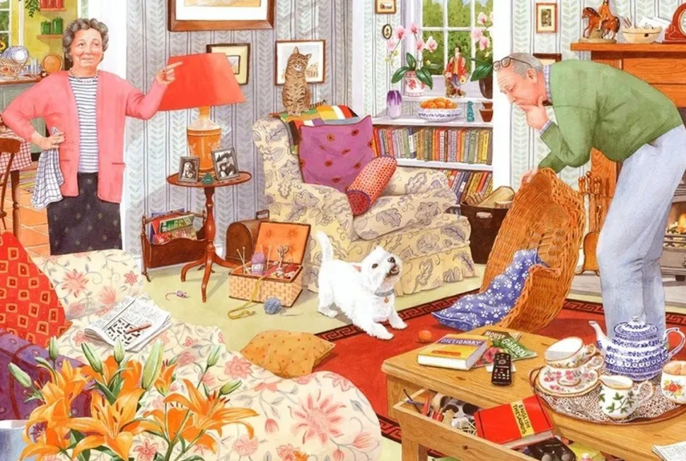 Ben je een echte puzzelliefhebber? Dan is de Where are my Glasses puzzel (1000 stukjes) precies wat je zoekt! Deze prachtige legpuzzel, geïllustreerd door de getalenteerde Tracy Hall, neemt je mee naar een sfeervolle woonkamer waar een ondeugende hond de bril van zijn baasje lijkt te hebben verstopt.